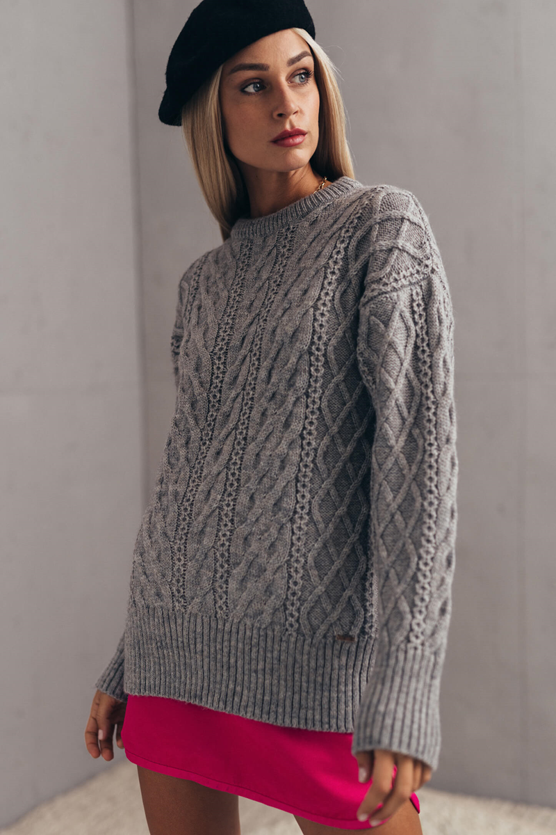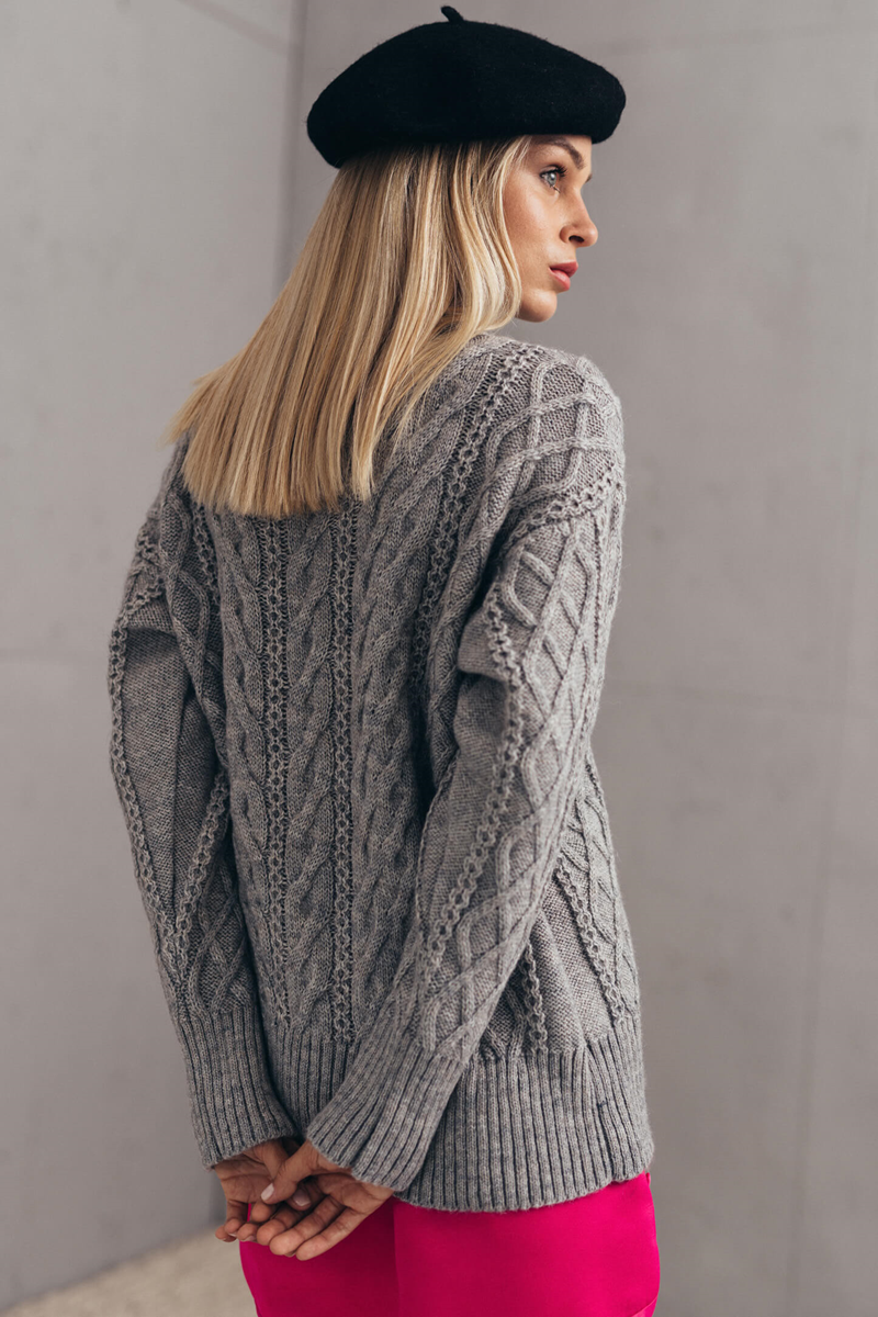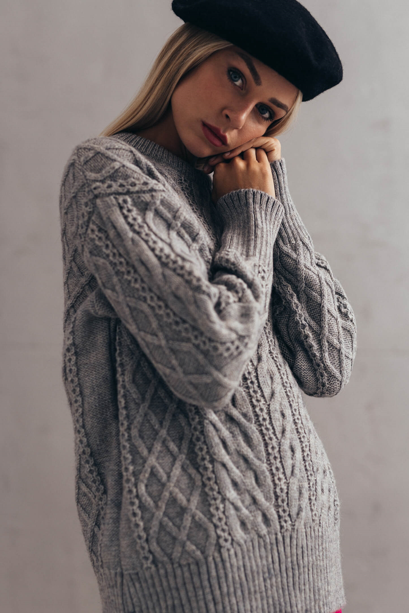 Ženski džemper od fine alpaca vune sa velikim ukrasnim prepletajima, sa okruglim izrezom i širokim renderima