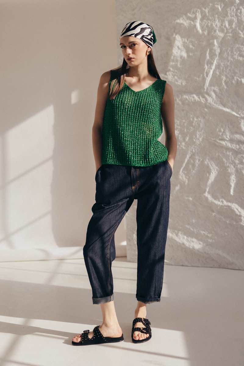 Ženska pletena majica od viskoze, bez rukava sa rupičastim prepletajem i metaliziranim nitima