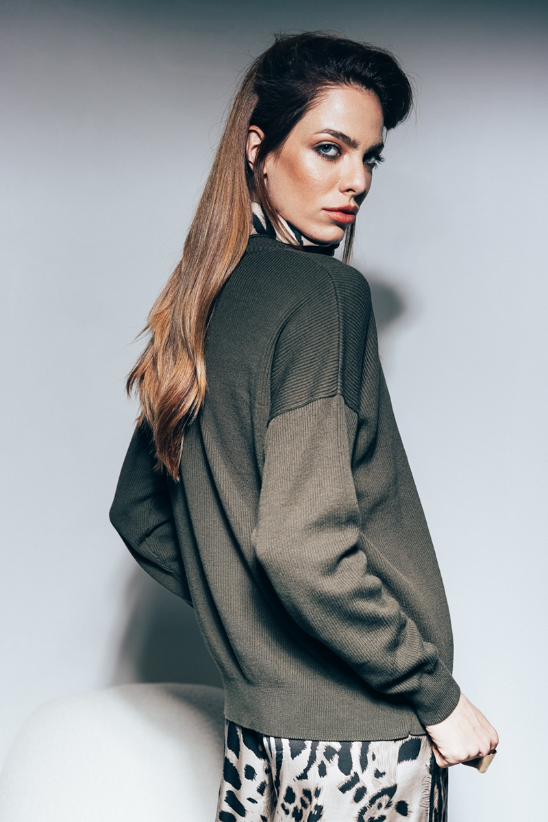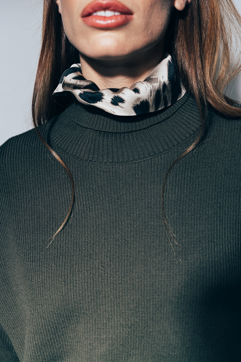Ženski džemper sa rolkom, šireg kroja sa sitnim perlfang prepletajem