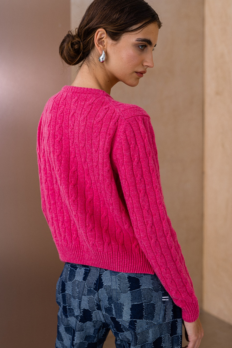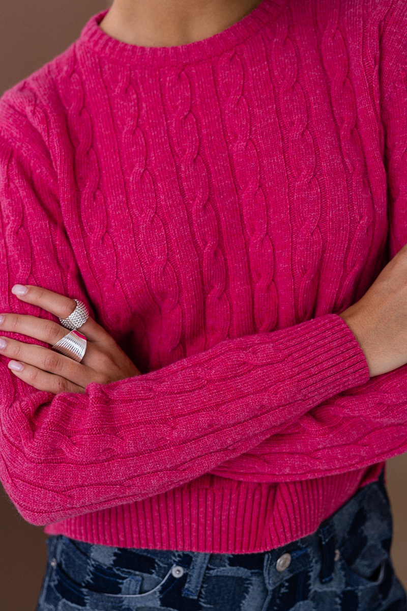 Ženski džemper sa okruglim izrezom od vune, kratkog kroja sa pletenica prepletajem