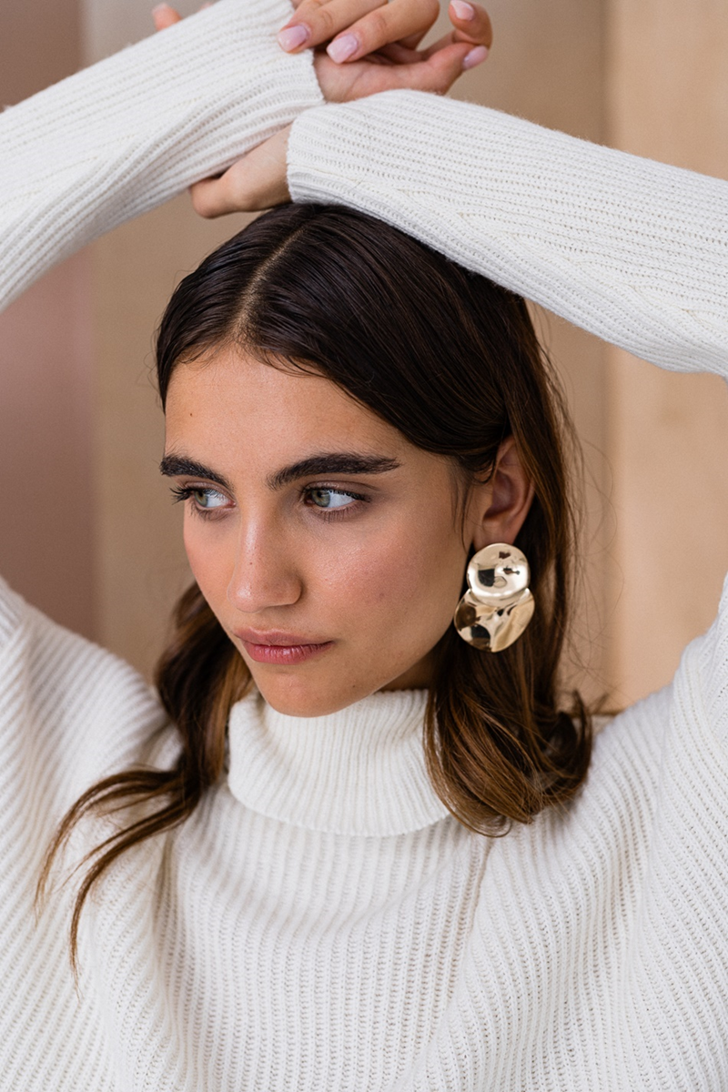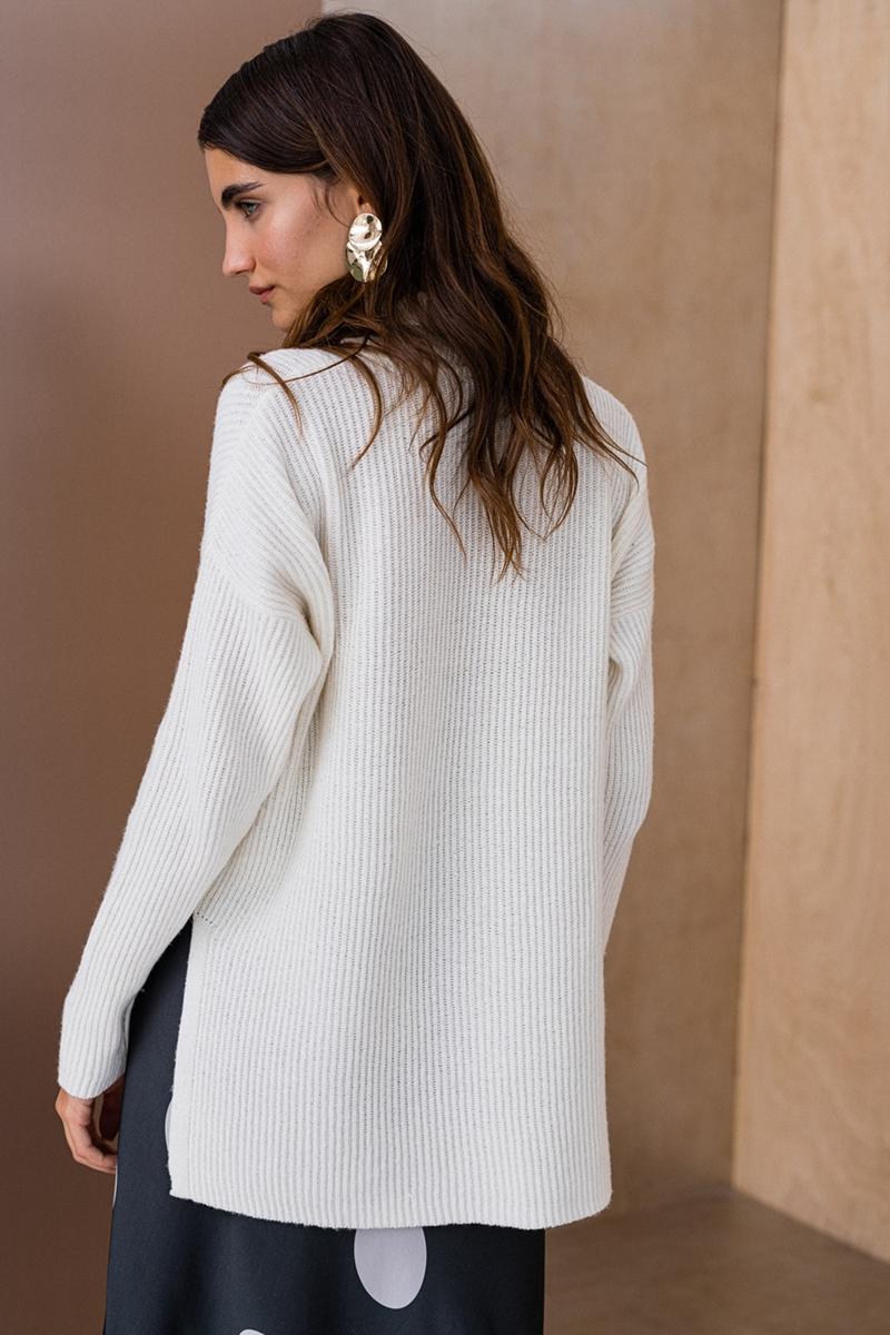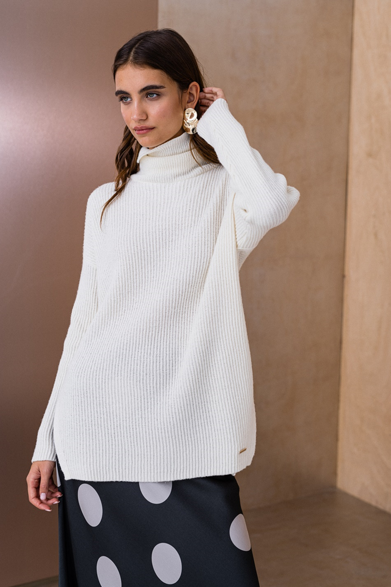 Ženski džemper sa rolkom od mešavine vune i kašmira, širokog kroja sa perlfang prepletajem i velikim izrezima sa strane.