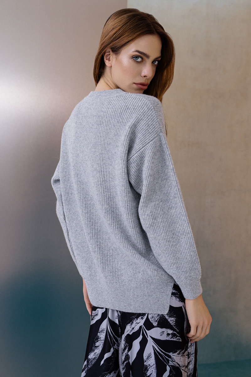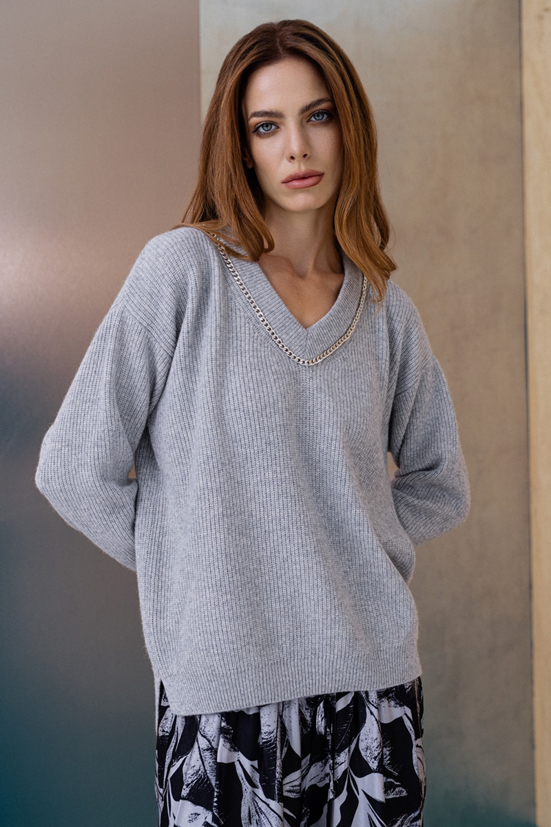 Ženski džemper sa V izrezom od vune, sa sitnim perlfang prepletajem i ukrasnim lančićem oko izreza