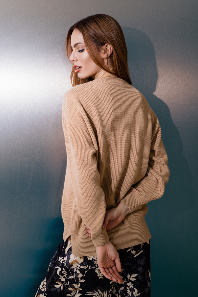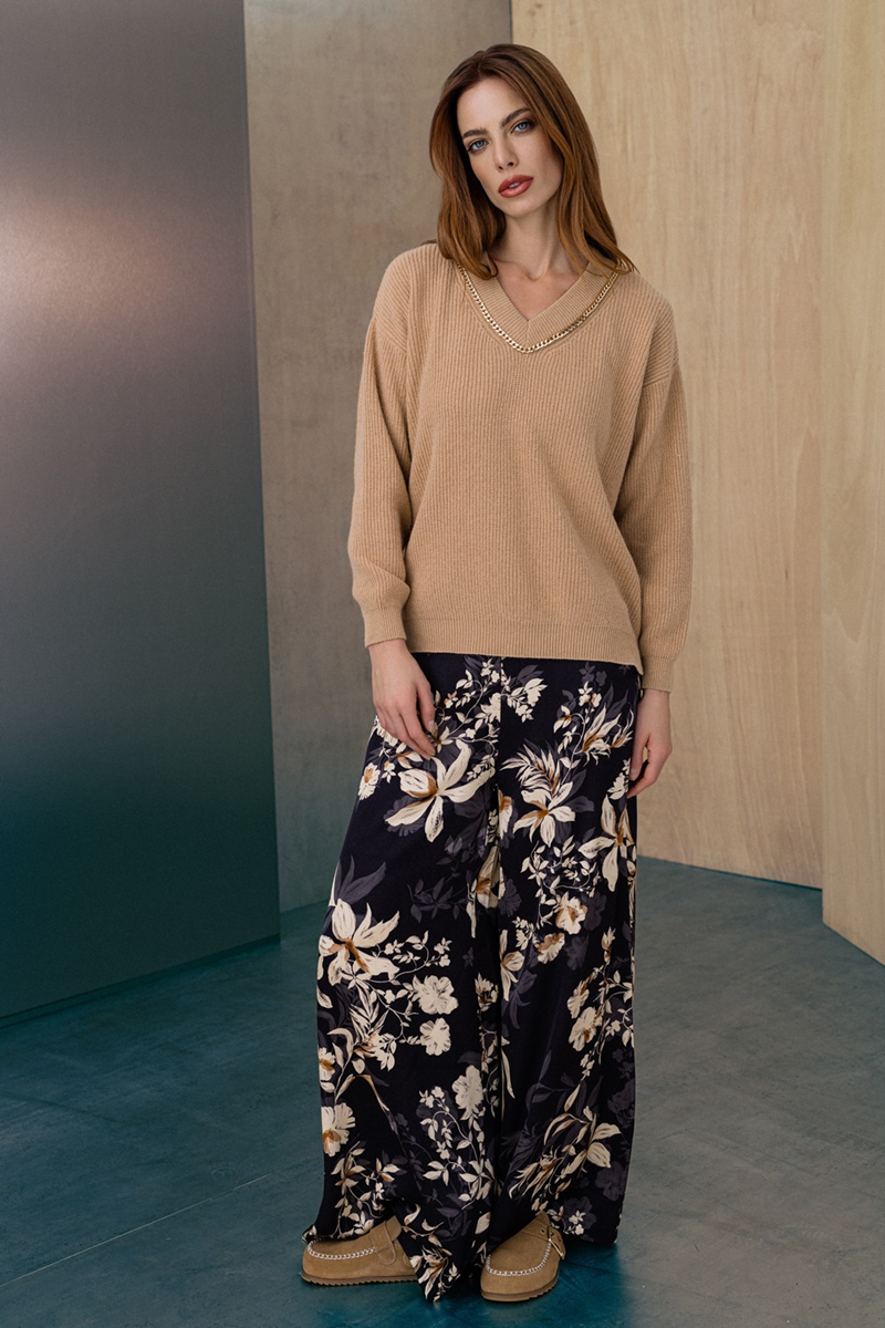 Ženski džemper sa V izrezom od vune, sa sitnim perlfang prepletajem i ukrasnim lančićem oko izreza