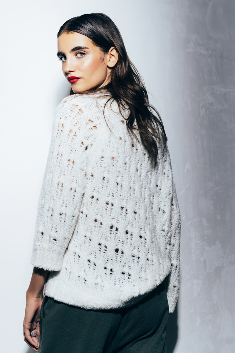 Ženski džemper sa 3/4 rukavima od mekanog prediva sa čipkastim prepletajem i čamac izrezom