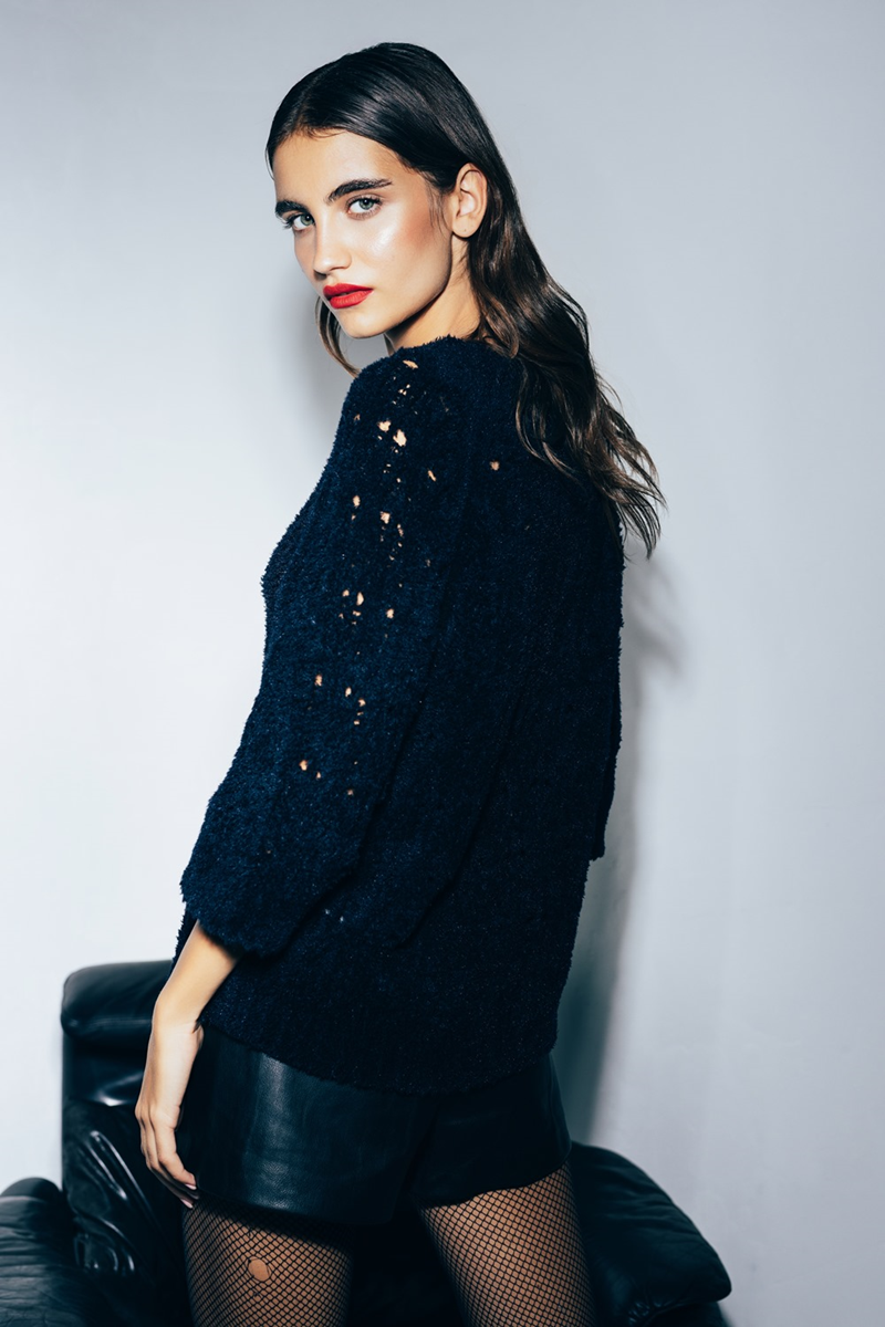 Ženski džemper sa 3/4 rukavima od mekanog prediva sa čipkastim prepletajem i čamac izrezom