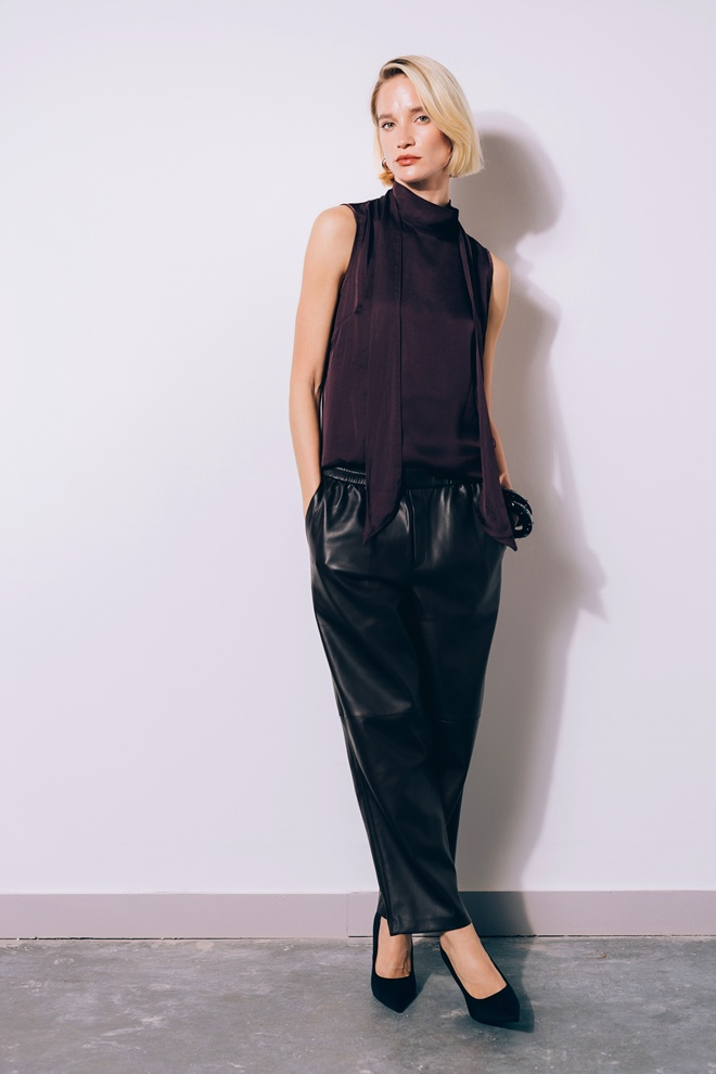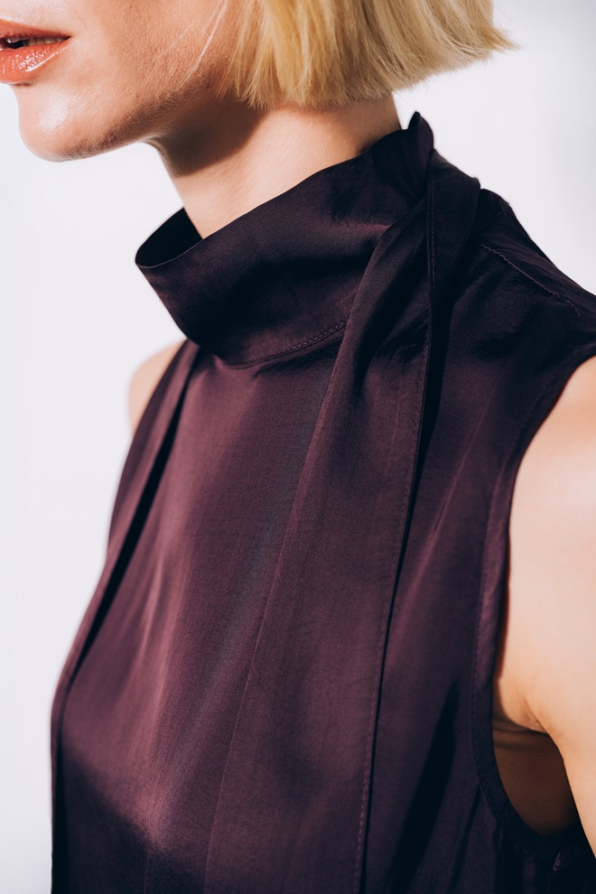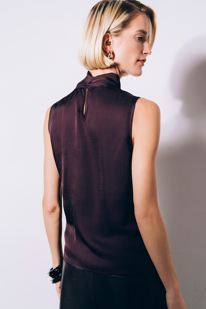 Elegantna ženska bluza u bogatoj bordo boji, dizajnirana bez rukava za jednostavan, ali sofisticiran izgled. Izrađena od kvalitetne, lagane tkanine koja pruža prijatan osećaj tokom celog dana, idealna za kombinovanje uz pantalone ili suknju. Boja daje dozu topline i karaktera, dok minimalistički kroj čini ovu bluzu pogodnom za poslovne, ali i casual prilike.