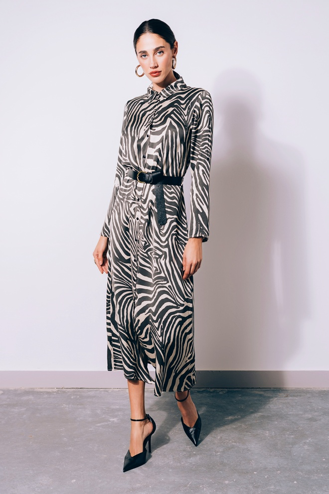 Košuljasti gornji deo i lepršava suknja čine haljinu elegantnom i udobnom. Zebra print u krem i crnoj boji donosi moderan i upečatljiv izgled, dok lagana viskoza pruža savršenu prozračnost za svaku priliku.