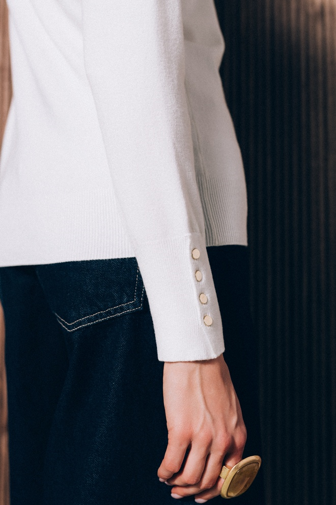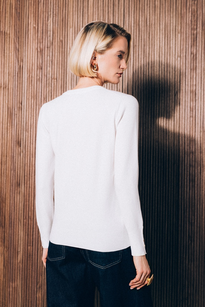 Model u čistoj beloj boji – simbolu svežine i minimalizma. Ovaj džemper sa klasičnim krojem pruža osnovu za brojne modne kombinacije i omogućava vam da kreirate stil koji je elegantan, a ipak udoban.
