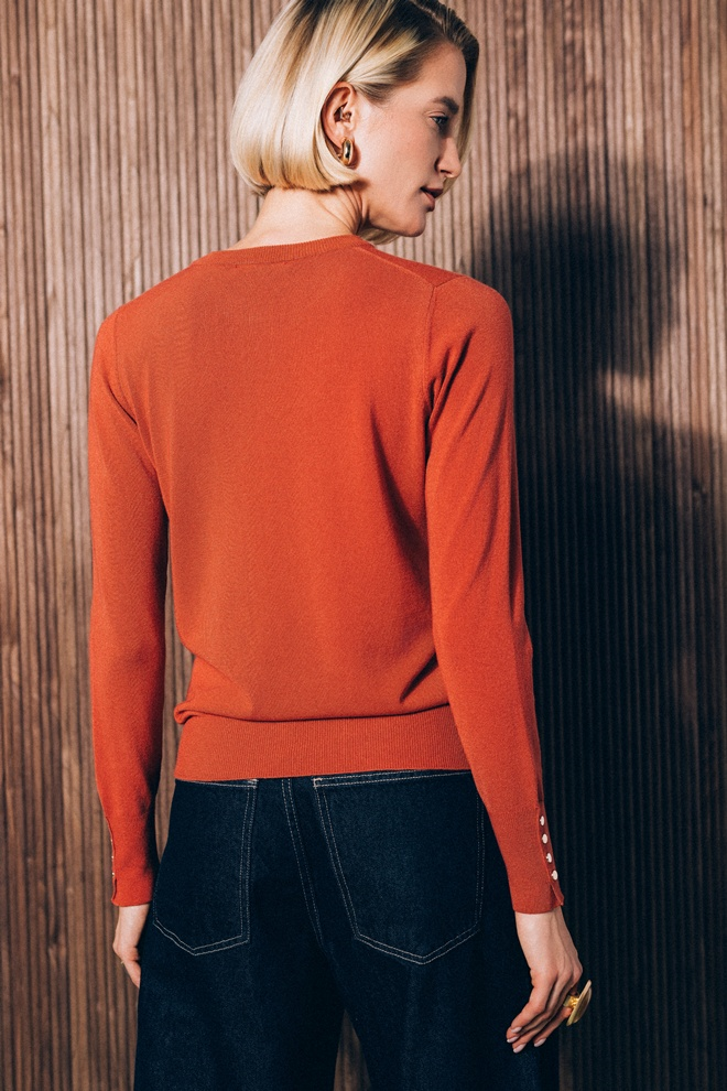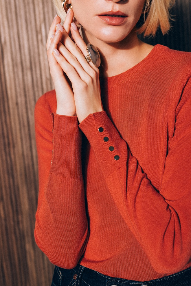 Ovaj ženski džemper ističe se svojom upečatljivom narandžastom bojom koja odmah privlači pažnju. Iako je model jednostavan i čist, njegova jedinstvena nijansa čini ga posebnom modnom izjavom. Džemper je dovoljno svestran da se kombinuje na više načina – može da bude deo svakodnevnog, casual stajlinga, ali i da se upotrebi za elegantniji izgled. Savršen izbor za one koji žele da unesu boju i karakter u svoju garderobu, a pritom zadrže minimalistički i sofisticiran dojam.