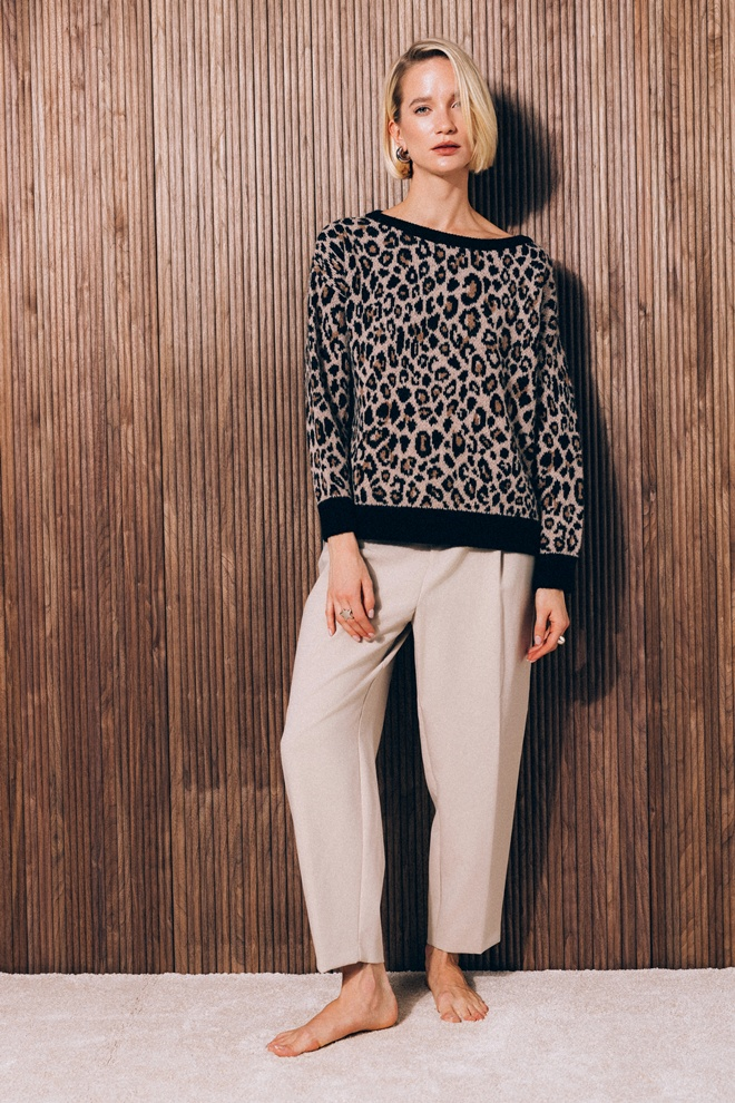 Moderan i efektan ženski džemper sa tigrastim printom u kombinaciji crne, tamno braon i svetlo braon boje. Napravljen od prijatnog i mekanog materijala koji pruža udobnost tokom celog dana. Ovaj prelep model je komad koji svaka žena treba da ima u svom garderoberu, jer se lako kombinuje uz farmerke, suknje ili pantalone i idealan je za sve prilike, od opuštenih dnevnih izlazaka do večernjih kombinacija.