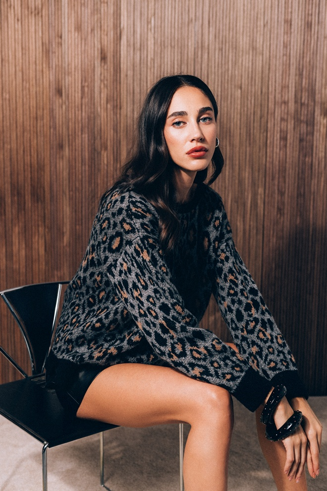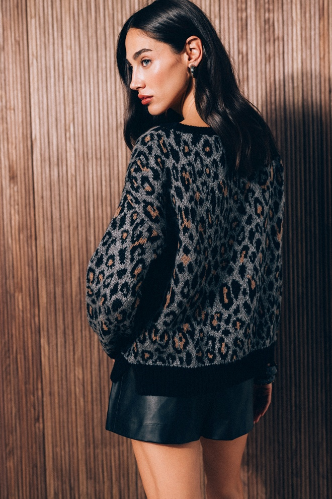 Stilizovan i upečatljiv džemper sa tigrastim printom u kombinaciji sive, crne i braon boje. Mekan i prijatan materijal pruža udobnost tokom celog dana, dok kroj i dezen čine ovaj komad idealnim za svaki garderober. Lako se kombinuje sa pantalonama, suknjama ili farmerkama i savršen je za opuštene dnevne aktivnosti, ali i za večernje izlaske.