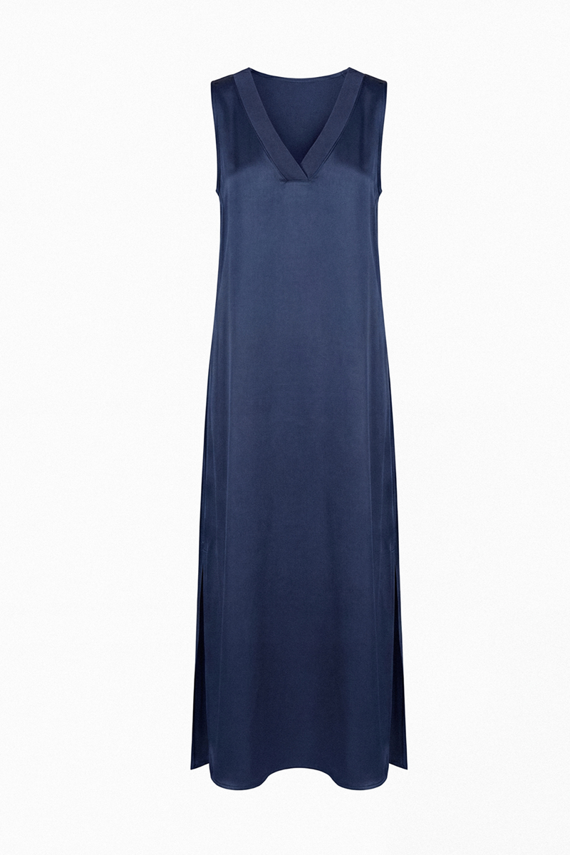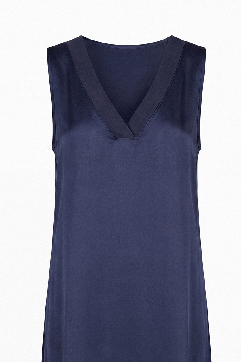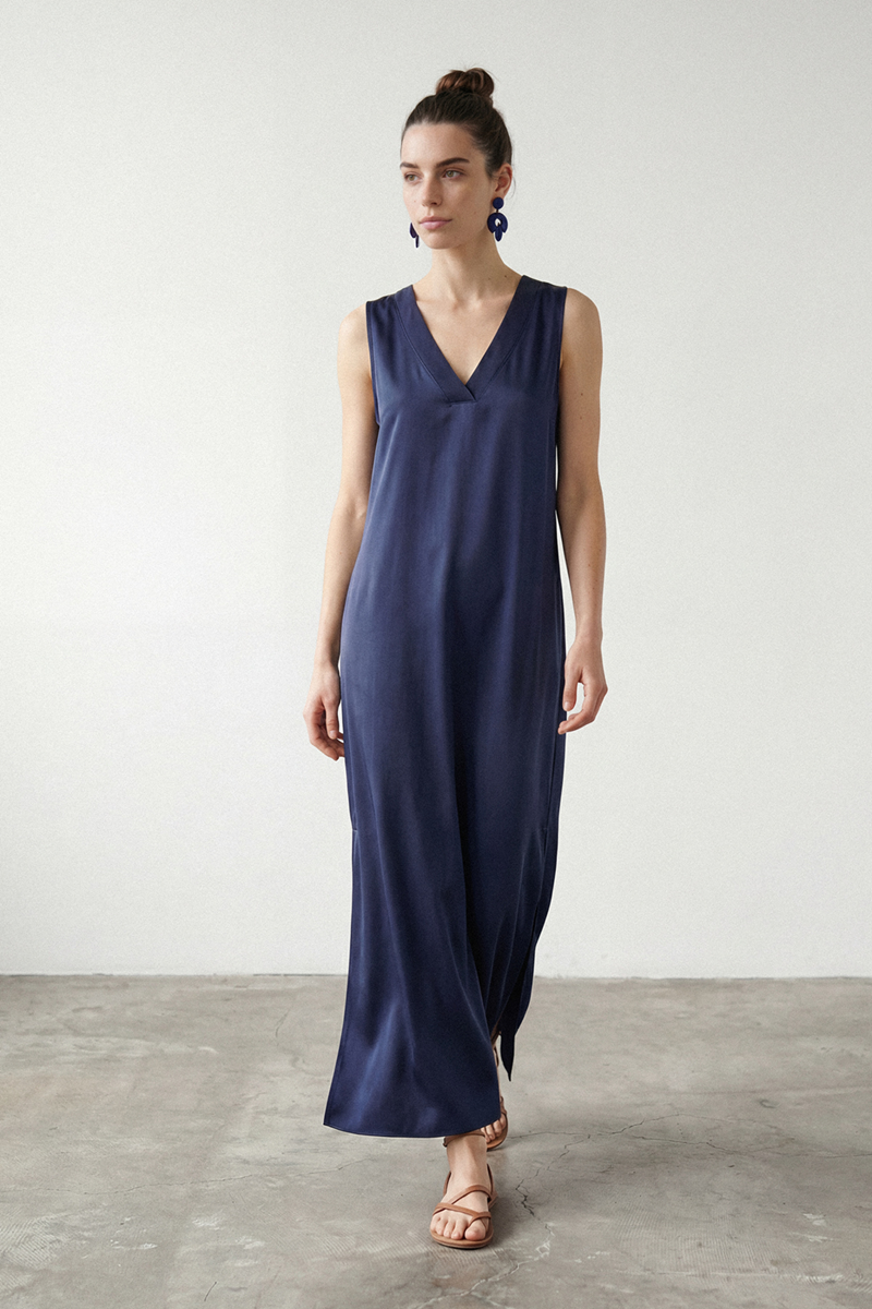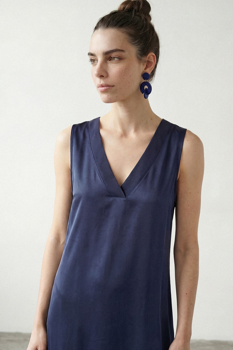 Ženska letnja haljina u tamno plavoj boji izrađena je od 100% viskoze, što joj obezbeđuje lagan i prijatan osećaj tokom nošenja. Zahvaljujući udobnom i prozračnom kroju, idealna je za tople letnje dane. Njena jednostavna, ali elegantna linija čini je odličnim izborom za svakodnevne i ležerne kombinacije.