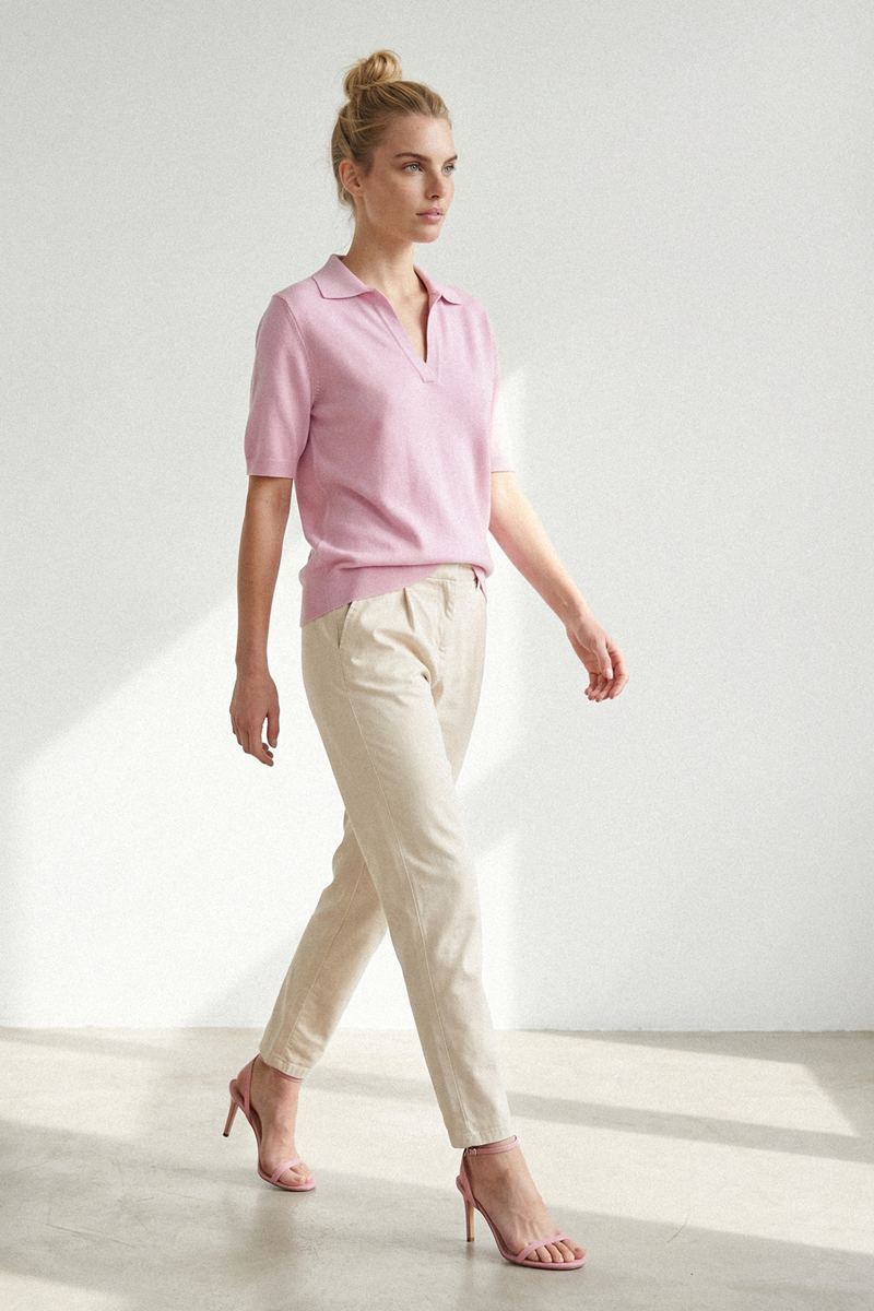 Ženska majica kratkih rukava modernog i udobnog kroja, izrađena od laganog materijala koji prijatno leži na telu. Savršena je za svakodnevno nošenje i lako se kombinuje uz različite outfite. Dostupna u svetlo roze i svetlo plavoj boji.